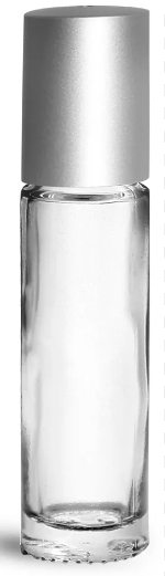 Klar glasflaska 10 ml med silver plastlock och roller i stål eller plast.
